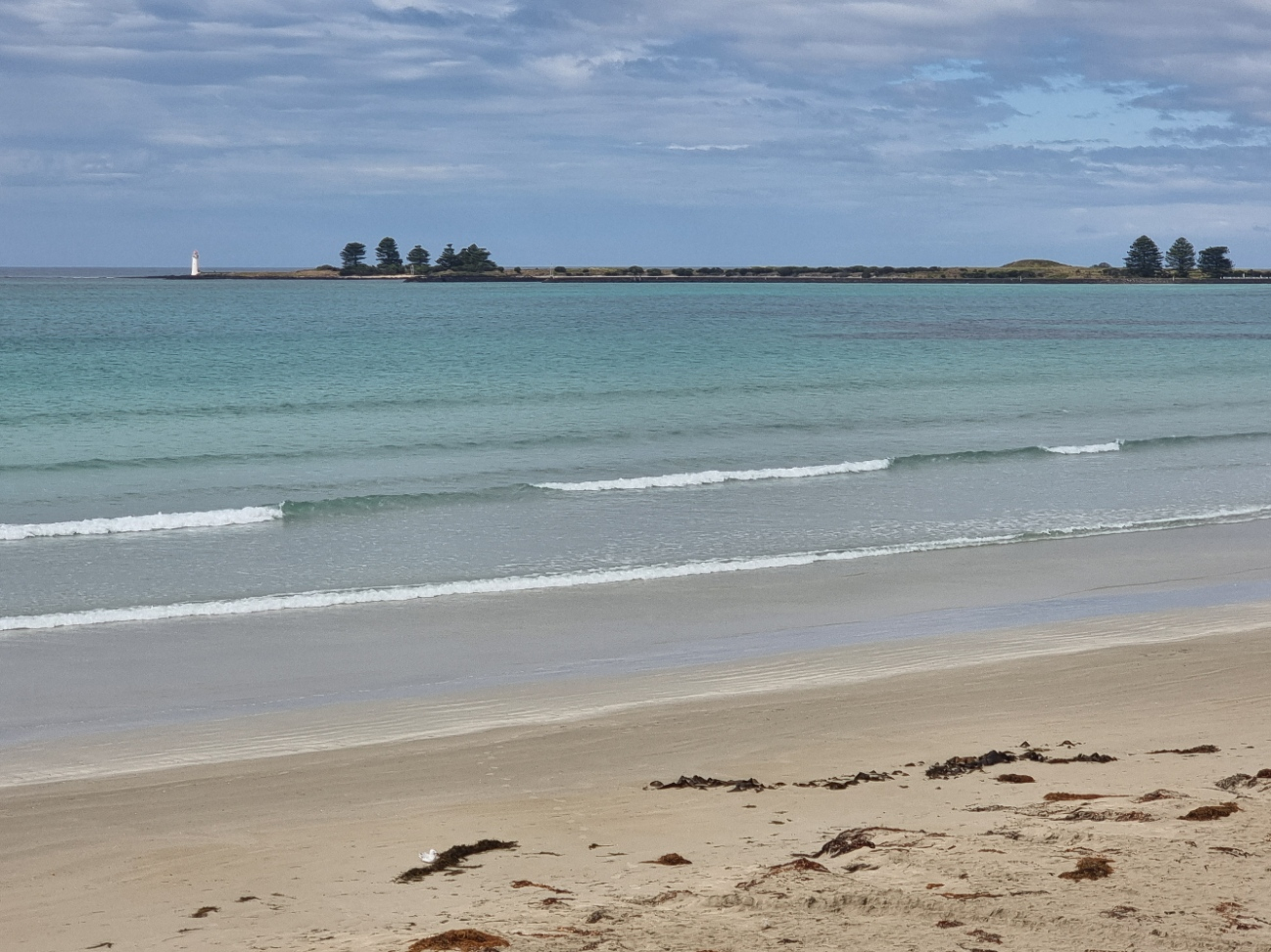 A wide sweep of Port Fairy bay, with the lighthouse on Griffith Island in the distance.